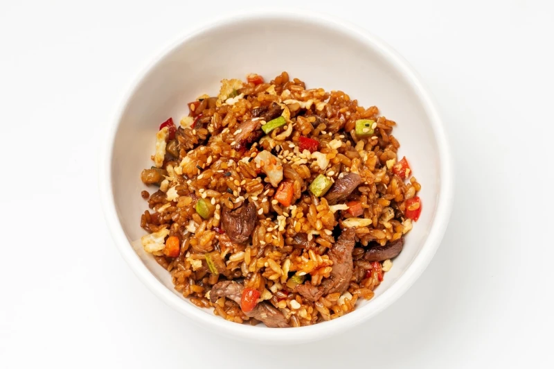 Рис с говядиной и овощами в фирменном соусе300 гГовядина, рис, морковь, репчатый лук, цукини, болгарский перец, шампиньоны, яйцо, кунжут, фирменный соус