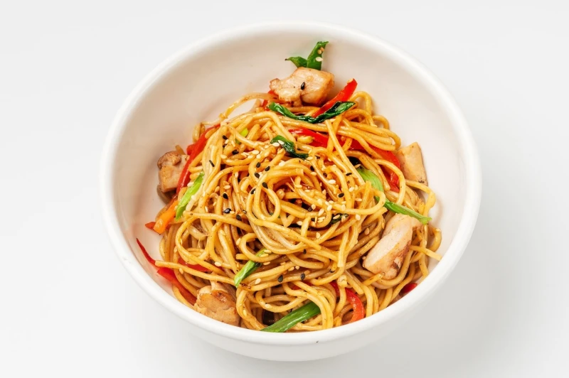 Лапша с цыпленком в соево-устричном соусе320 гФиле бедра куриное, лапша рамен, болгарский перец, репчатый лук, морковь, ростки сои, зеленый лук, кунжут, соево-устричный соус