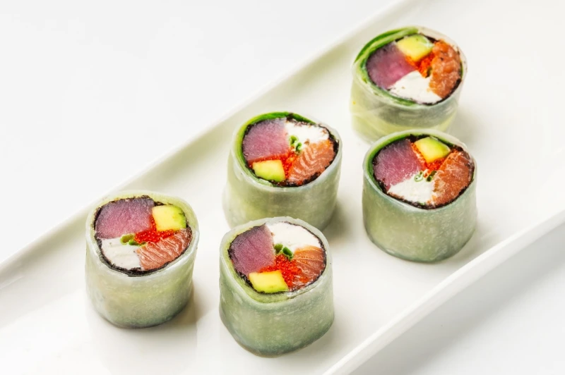 Тунец, лосось, творожный сыр, авокадо, огурец, тобико, зеленый лук, рисовая бумага, водоросли нори, подается со специями