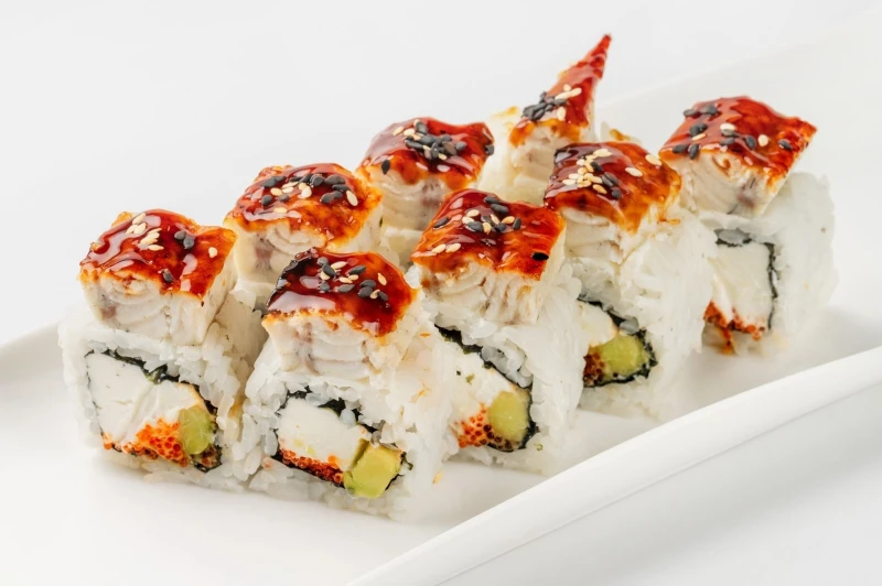 Угорь, творожный сыр, авокадо, тобико, соус спайси, соус унаги, кунжут, рис, водоросли нори, подается со специями