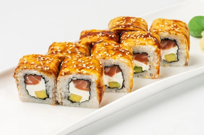 Угорь, лосось, творожный сыр, огурец, соус терияке, кунжут, рис, водоросли нори, подается со специями