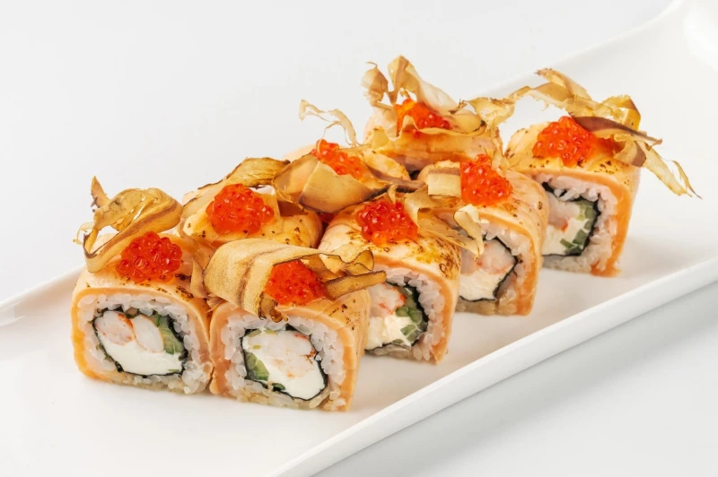 Лосось,креветка, творожный сыр, огурец, красная икра, стружка тунца, рис, водоросли нори, подается со специями