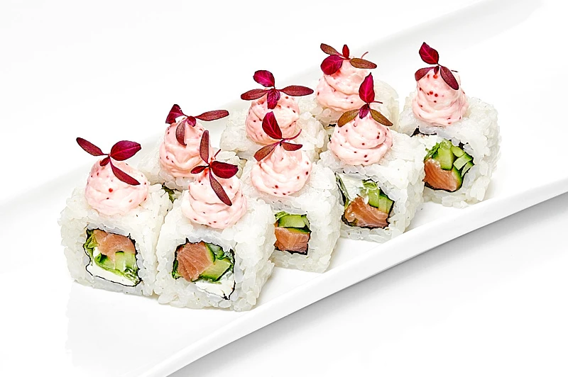 Лосось, творожный сыр, огурец, лист салата, соус лава со снежным крабом и тобико, рис, водоросли нори, подается с соусом