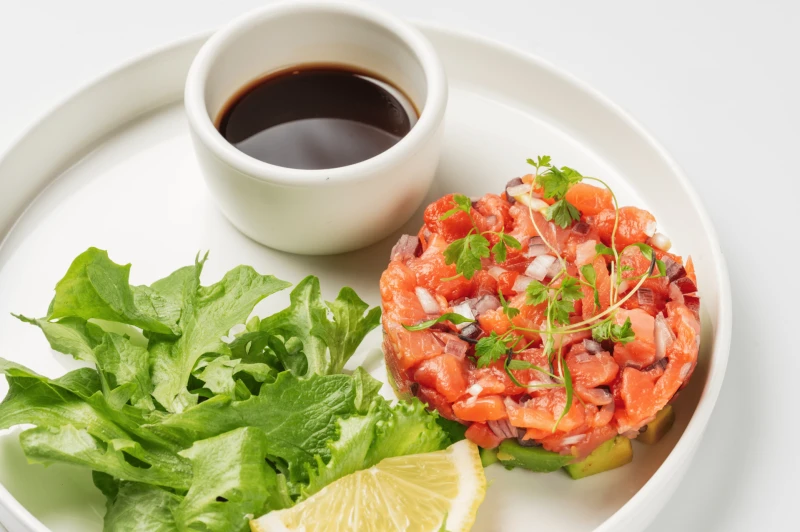 Лосось, авокадо, репчатый лук, лимон, подается с медово-соевой заправкой