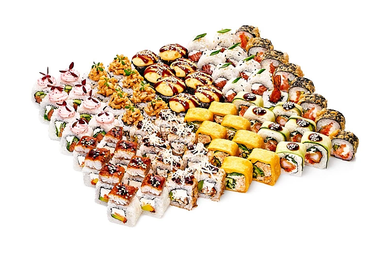 С лососем и сыром; Ронин ролл; Дракон; Тортилья с лососем терияки; Запеченный с копченой курицей; Темпура с лососем и творожный сыром; Эби темпура в слайсах огурца; С угрем, снежным крабом и сыром; С угрем и копченым кальмаром - 72 шт, подается с соусом (7 шт)