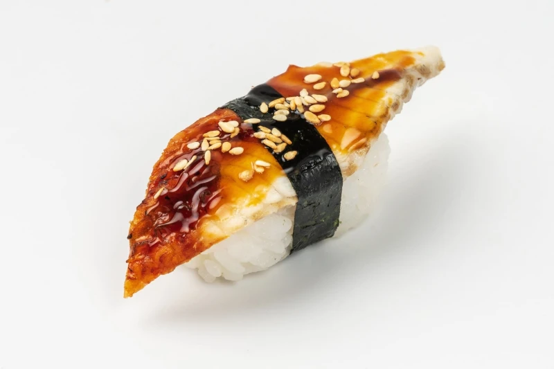 Угорь, рис, соус унаги, кунжут, водоросли нори, подается с соусом
