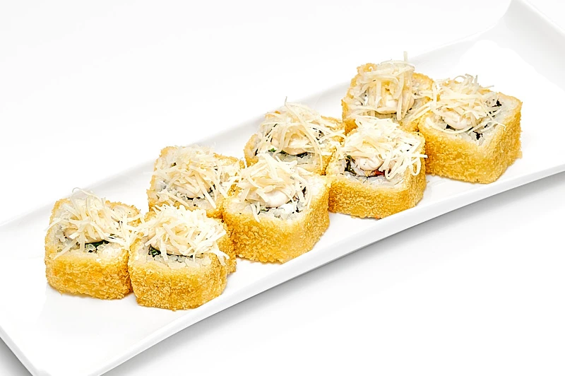 Филе копченой курицы, творожный сыр, помидор, лист салата, соус цезарь, сыр пармезан, рис, водоросли нори, подается с соусом